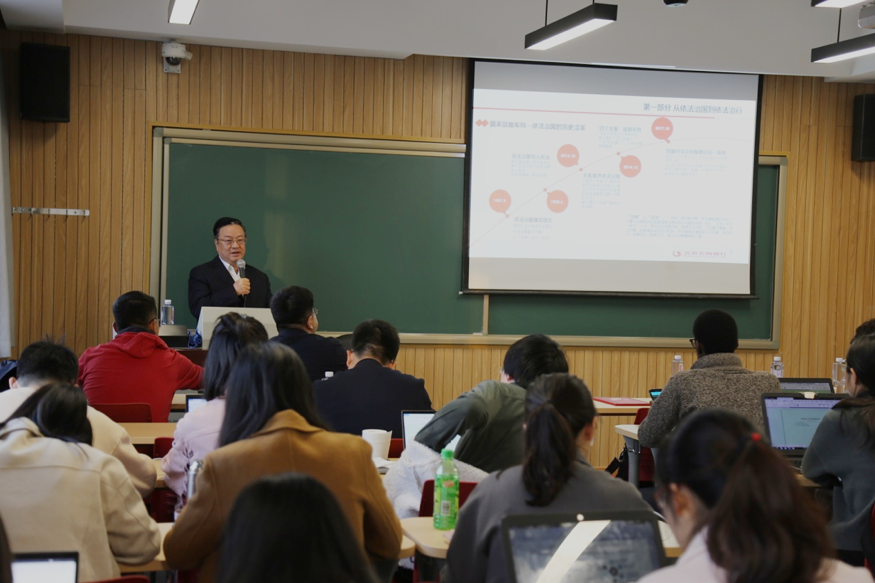 讲座开始前,尹飞院长为张卫国总经理颁发了beat365研究生兼职导师聘书。随后,张卫国总经理围绕银行法务人员的基本素养,分别从法治银行建设、商业银行法律工作的主要内容和银行法务人员应具备的职业素养三方面进行了讲解。