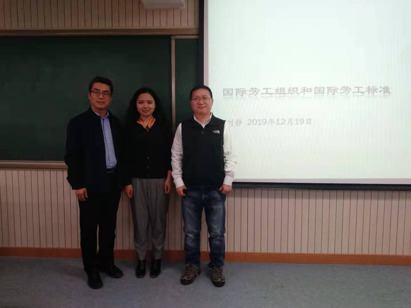 2019年12月19日下午,人社部高级公务员培训中心刘静副处长做客我院,在主教519教室作主题为“国际劳工组织与劳工公约的现状与发展趋势”的学术讲座。讲座由中央财经大学劳动法和社会保障法研究中心主任沈建峰教授主持,副主任李海明副教授参加,一百余人到场聆听。