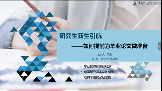 2020年3月30日,我院简爱博士分别于上午10点和晚上7点30分,为学院全体师生带来了两场疫情期间“独特”的讲座,讲座主题为“如何提前为毕业论文做准备”。本次讲座作为中财beat3652019年—2020学年“新生引航工程”系列讲座之二,吸引了众多师生聆听,院党委副书记徐颖研究员、周游副教授、殷秋实副教授,各年级辅导员及全体2019级本科生和硕士研究生新生共计400余人,通过腾讯会议软件共同学习探讨提前准备法学毕业论文的方法。