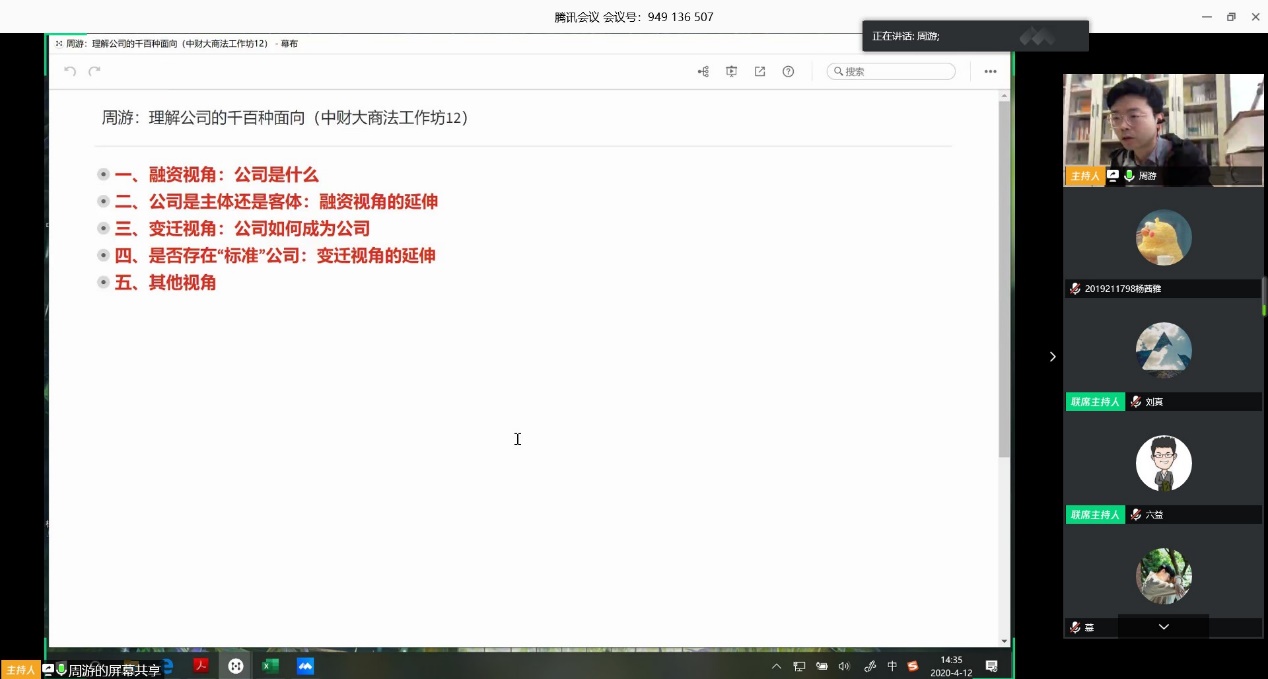 2020年4月12日下午,商法工作坊2020年第4期(总第12期)在直播平台上以线上交流与讨论的方式举行,此次活动主题是研读《公司宪治论》一书。中央民族大学beat365讲师邵六益博士作为特邀嘉宾,beat365周游副教授作为指导老师参与了本次活动。工作坊主要由指导老师引导、发言人展示、成员及其他与会者提问及评价、评议人评议、特邀嘉宾发言、指导老师总结等环节组成。此次线上活动共有60余名校内外师生及业界人士参与讨论。