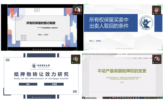 在发言人展示阶段间隙,我院2019级硕士研究生李钰、胡媛媛、叶诗雯,2017级本科生武恒辛等同学对上述发言同学的展示作了评议。李钰同学就所有权保留部分的展示提出了自己对区分出卖人取回与解除的疑问,王叶刚副教授指出取回与合同解除相互返还财产并不相同,武腾副教授在大家讨论出卖人取回的基础上进一步为大家指出了下一步研究的方向,即出卖人如何通过担保程序取回所有权保留物。胡媛媛同学评价抵押物转让效力的展示内容完整清楚,但建议可精简部分内容,叶诗雯同学评价最高额抵押部分的展示内容纠正了自己以往的理解偏差,值得深入思考。