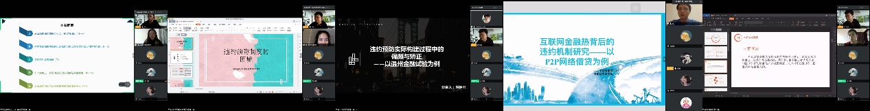 随后,我院2019级研究生杨娟,2018级本科生彭欣悦、牛天赫、周雨欣以及2019级本科生王子晴五位同学作为评议人,就发言人的表现进行评价并提出建议。周雨欣同学评价马晓晴同学的发言结构完整、思路明了,内容细节处理得很好,同时建议其调整语速,在介绍应对系统性违约的相关制度的时候融入一些简单的实例。牛天赫同学梳理了李明桓同学的发言内容,认为李明桓同学的发言结构清晰、思维连贯性强,肯定其发言对于书目内容的归纳与概括非常到位,并提议可加入本书中对于完善制度的解决措施的介绍。彭欣悦同学认为洪恬君同学的发言娓娓道来、深入浅出,赞赏其清楚直观的手绘示意图,同时就防范金融风险融资措施种类、民间融资与民间借贷的区分提出了自己的疑问。王子晴同学认为袁旻晖同学的发言逻辑清晰、时长和语速把控很好,但PPT演示上文字内容过多、应当突出关键。杨娟同学评价赵天同学的总结体系清晰、表达流畅、准备充分,也有结合书目内容进行进一步拓展,但囿于时间有限,在内容上阐述不够深入。