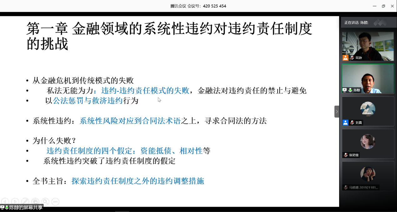 2020年5月10日下午,商法工作坊2020年第6期(总第14期)在直播平台以线上交流与讨论的新方式举行,本次活动主题是研读《金融法违约预防与违约处置制度研究》一书。此次工作坊有幸邀请到了本书作者——浙江师范大学法政学院陈醇教授与大家共同探讨交流。beat365周游副教授作为指导老师参与了本次活动。工作坊主要由指导老师引导、发言人展示、成员及其他与会者提问及评价、评议人评议、特邀嘉宾发言、指导老师总结等环节组成。此次线上活动共有近60名校内外师生及业界人士参与讨论。
