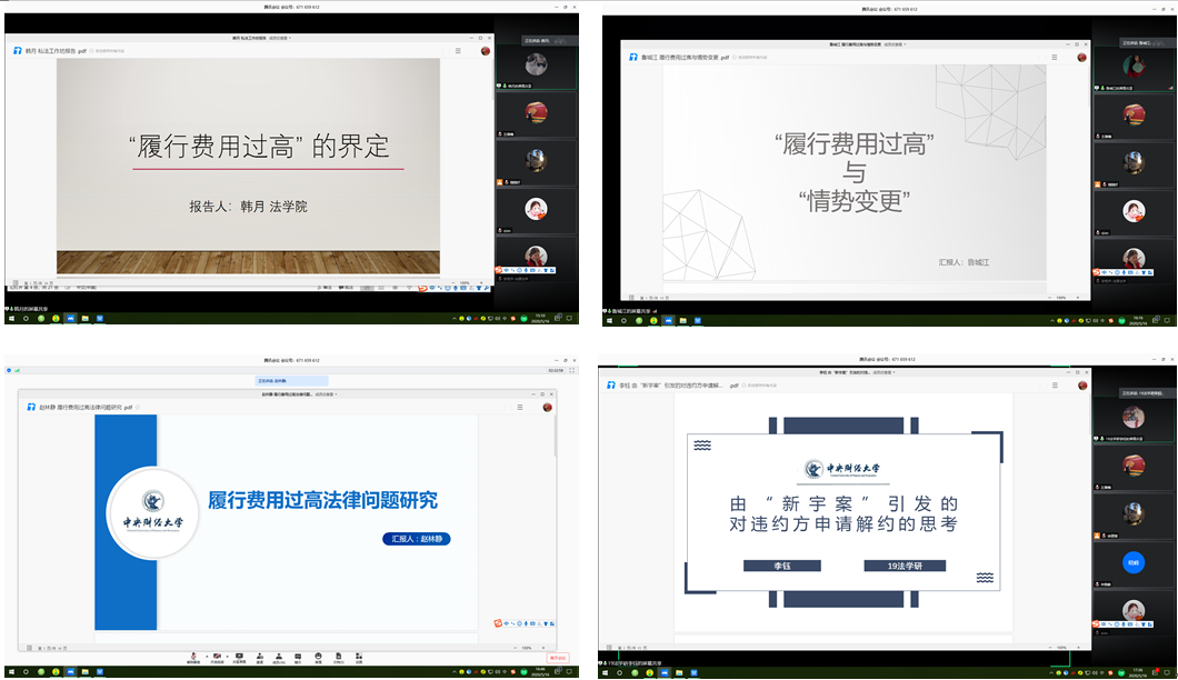 在发言人展示间隙,我院2019级硕士研究生蒋睿、程相宜、张俏和安悦齐分别对四份报告进行了评议。蒋睿指出韩月的报告层次分明,内容详实,比较现实地回应了司法实践中的一些难题,同时对报告的结构提出修改建议。程相宜首先对鲁城江的报告予以肯定,并且分享了自己对情势变更标准的看法,即目前适用情势变更判决的案例很少,可见适用情势变更制度的要求很严格,因此选取债务人利益显著低于成本作为标准对债务人过于有利。此外,程相宜建议在民法典去掉非不可抗力的要件之后,报告中应当对情势变更、履行费用过高和不可抗力的交叉一并予以讨论。张俏在赵林静报告的基础上,对目前履行费用过高比较对象的各种学说进行体系化梳理,并对报告中借鉴最高人民法院关于民间借贷利率的限制性规定,以及合同法解释(二)中确定的明显不合理高价的解释标准,类推适用后得出的当履行费用达到债权人履行利益的130%时认定为过高的结论进行了批判。安悦齐认为李钰的报告论证明晰、说理有据,并指出违约方解除权不应在立法上得以确认,但有必要规定重大事由解除权。