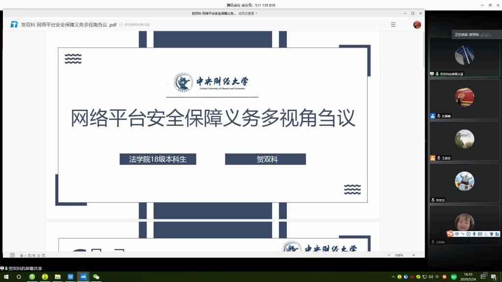 随后,我院2019级硕士研究生张俏和2018级本科生贺双科先后就网络平台安全保障义务这一主题作了报告。张俏同学以顺风车平台为切入点先概述了顺风车平台业务应当属于居间性质,进而根据德国交往安全义务界定了顺风车平台的安保义务,并从义务性质角度提出了安保义务属于侵权法上的义务,应当在个案中具体认定网络平台承担损害赔偿责任的范围。贺双科同学在报告中就《人身损害赔偿解释》与《侵权责任法》对安保义务人向第三人有无追偿权的不同规定提出立法思路可以借鉴美国侵权责任法中的混合责任模式,并在介绍了关于安保义务类似案情不同判决的案例后,进一步指出对安保义务主体和安保义务内容界定的思考。在其他成员评议阶段,我院2018级本科生蒋沁珂评议上述同学的报告内容详实、逻辑清楚;2019级硕士研究生赵林静提出了自己的疑问,即如果对网络平台规定事前事中事后三阶段监管义务是否过重,以及网约车业务中车主是否属于消费者。张俏同学解释监管义务内容主要为线上监督,不会导致网络平台义务过重,同时自己并不认为网约车车主属于消费者。评议过后武腾副教授跟随大家提出的疑问鼓励同学们进一步思考网约车车主是否属于消费者,并且在车主受到损害的情况下网络平台是否需要承担义务。