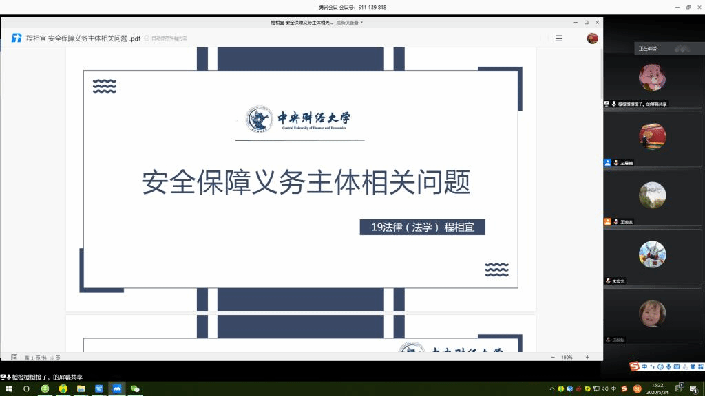 接下来,我院2019级硕士研究生朱文璐、蒋睿和2018级本科生杨帆先后针对网络平台安全保障义务这一主题继续深入作报告。朱文璐同学分析了电商平台安保义务的理论基础和法律规范,之后提出《电子商务法》中规定的“相应的责任”应当具有包容性。蒋睿同学借鉴美国侵权法“红旗”规则和“瞭望塔”规则陈述了自己对网络平台安全保障义务内容与举证责任的思考,杨帆同学重点讲解了安保义务的归责原则、第三人侵权下安保义务人的责任形态以及义务人是否有追偿权的不同学说。报告完毕后2019级硕士研究生陈诗琦、韩月和2018级本科生王诺实评议上述同学作报告时可考虑结合案例多谈解释论。