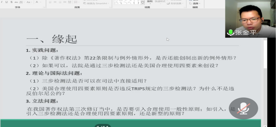首先,张金平博士指出本期讨论美国合理使用四要素原则是否违反TRIPS三步检测法,旨在从比较客观的角度探讨三步检测法的内涵和功能,帮助同学们了解我国《著作权法》第三次修订草案有关引入三步检测法引发的争议。进而,他将著作权法上的限制与例外、合理使用等概念进行了初步厘清,并对TRIPS和伯尔尼公约中三步检测法每一步涉及概念的界定和三步检测之间关系的解释所可能涉及的解释方法进行概述,为本次线上研讨作了完整的背景铺陈。