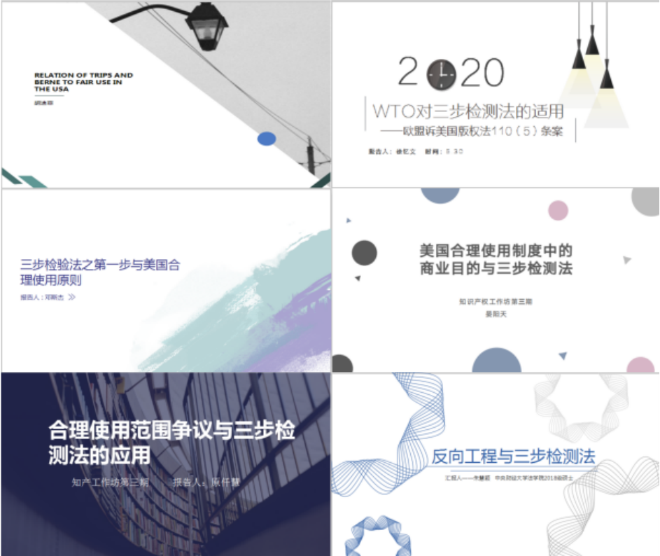 胡迪菲同学以“美国合理使用与TRIPS、伯尔尼公约的关系”为题,介绍了美国合理使用四原则的基本内容,对伯尔尼公约第9条和TRIPS协议第13条进行了标注式对比,并以表格形式从理论基础、主体客体、限制途径、评价标准等四方面对三种规定的内涵构建起框架性认知。徐忆文同学以“WTO对三步检测法的适用——欧盟诉美国版权法110(5)条案”为题,以案说法,在观察欧盟与美国的争端解决过程中,细致拆解论述了TRIPS协议第13条的要件内涵,其赞同WTO专家组对三步检测法适用范围的扩张,使得三步检测法被激活并引起各界的重新检视,同时分析了国家政策目标、经济因素对版权争端解决的重要影响。邓斯杰同学以“三步检验法之第一步与美国合理使用原则”为题,先对三步检测法之第一步“某些特殊情况”进行了文义解释,而后阐释了美国合理使用原则的不确定性和广度,继而分析后者是否符合前者,并引入了大陆和英美法系的不同思考维度。晏阳天同学以“美国合理使用中的商业目的与三步检测法”为题,从条文本身着手分析,以相关质疑与回应的方式引出问题,在从历史走向未来的丰富实践背景下,论述了美国合理使用原则与三步检测法的分歧与融合。原仟慧同学以“合理使用范围争议与三步检测法的应用”为题,介绍了欧盟、澳大利亚、新西兰等对美国版权法合理使用原则与三步检测法一致性的质疑,并在三步检测法的每一步标准下详细审视了合理使用原则的契合程度与突破之处。朱慧颖同学以“反向工程与三步检测法”为题,探究美国合理使用原则在反向工程中适用时所达到的对保护版权人权利和鼓励创作、竞争之间的适当平衡。