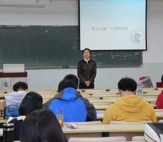 会议伊始,蒙广平老师首先发表讲话,她对新加入研会的同学表示欢迎,同时肯定了研究生会在过去工作中取得的成绩和付出的努力。研究生会作为学院与学生之间的桥梁和纽带,在服务学生成长、繁荣校园文化、助力学院发展等方面发挥了应有的作用。蒙老师强调,研究生会是一个非常锻炼同学和提升能力的平台,希望在研究生会工作的同学能够有始有终,严于律己,认真及时完成交给的各项工作任务,在自我锻炼的同时更好得为同学服务。提出的主要要求为以下五点:一、在学院党总支领导下开展相关工作;二、端正加入研会组织的动机,以为全体研究生同学服务为宗旨;三、珍视干部身份、珍惜锻炼机会,努力提升自己;四、广泛团结同学,发挥学生干部的模范带头作用;五、不忘学生身份和主营业务,协调好工作与学习,做好时间管理。