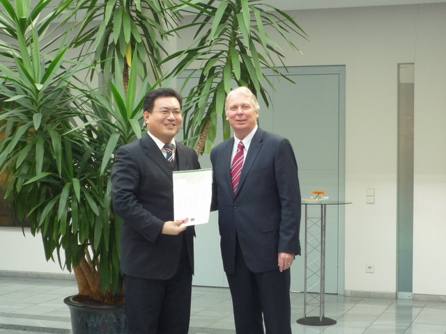 据悉,德国联邦总理奖全称为德国联邦总理未来杰出领袖奖。该项目侧重在社会科学领域选择中美俄三国政治、经济、学术领域杰出青年人才到德国进行高层次学术交流。该项目由当时的德国总理科尔提议,于1990年两德即将统一之际启动,最初仅面向美国;2001年纳入俄罗斯;经默克尔总理推动,2006年启动了该项目的中国部分。目前,该项目每年从中国、美国、俄罗斯各选择10名35岁以下人员到德国进行交流。经过激烈竞争,我院尹飞副教授获得了这一项目,成为2010年入选该项目的三名中国高校学者之一。在赴德之前,德国驻华大使馆举行了专门的颁证仪式,德意志联邦共和国驻华特命全权大使施明贤博士(Dr. Michael Schaefer)受委托为尹飞等人颁发了联邦总理奖证书。