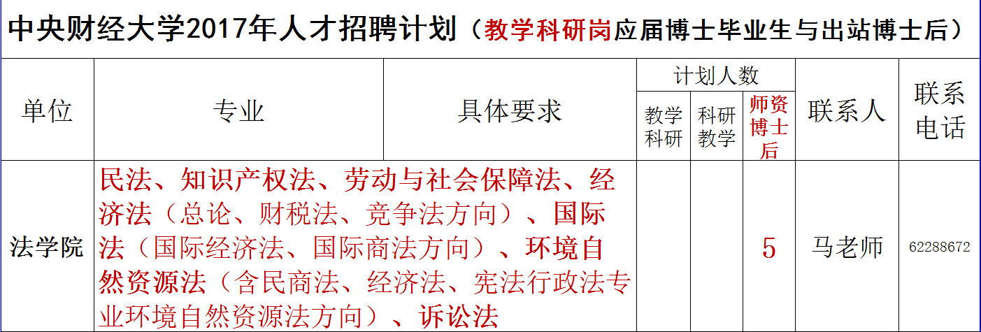 2.学校招聘政策咨询电话:010-62289012,尹老师、马老师。招聘网址为http://zhaopin.cufe.edu.cn:8080/hire/hireNetPortal/search_zp_position.do?b_exit=exit,或登陆中央财经大学人事处网页“招聘信息”栏目点击“中央财经大学人事招聘系统”链接进入。